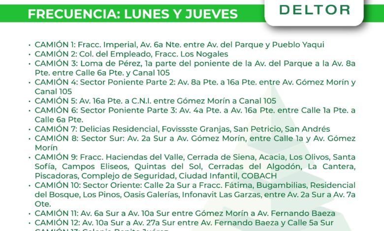 Deltor invita a todas y todos los delicienses a consultar con frecuencia las rutas y días de servicio, ya que el éxito de este nuevo esquema depende también de la participación responsable de la ciudadanía. Además, con estas nuevas rutas, se espera reducir los focos de basura y mejorar la imagen y limpieza de las colonias, tanto urbanas como rurales.
