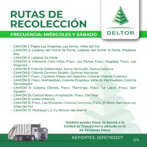 Con el objetivo de mejorar el servicio de recolección de basura, la empresa Deltor anunció a partir de este lunes la puesta en marcha de nuevas rutas de recolección de residuos en la ciudad de Delicias y sus colonias rurales, dividiendo la cobertura por días específicos de la semana y zonas estratégicas.