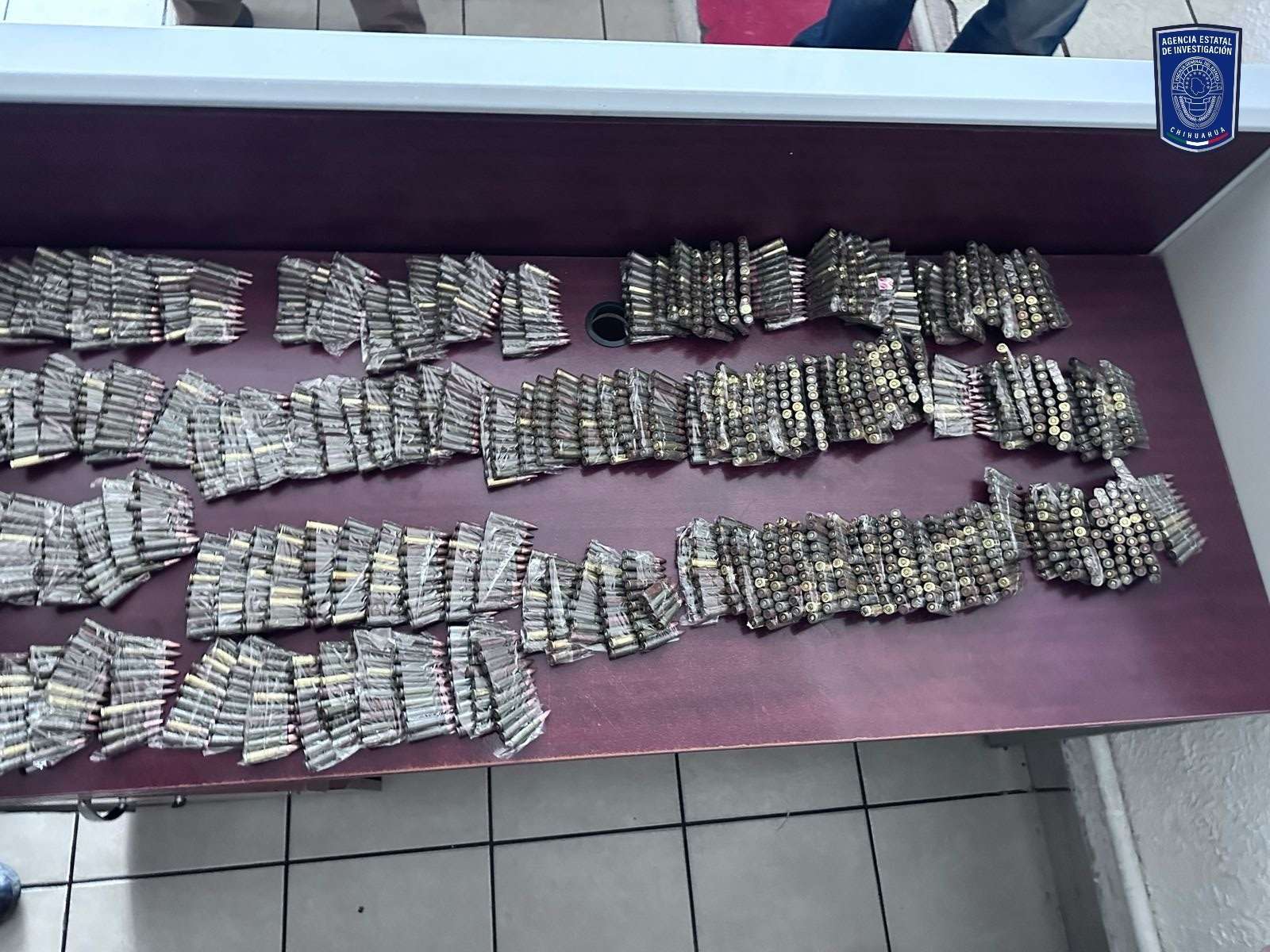 Asimismo, se localizaron dos mochilas, una de color negro y otra azul, las cuales contenían 10 cargadores para arma larga y 1,854 cartuchos útiles de diferentes calibres; también se encontró un fusil de asalto color negro, con cachas de madera, marca Norinco, calibre 7.62 x 39mm, conocida como “cuerno de chivo”.