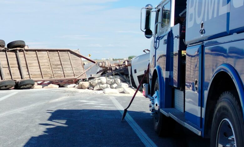 Meoqui.- Un accidente vial tipo volcadura se registró este sábado por la tarde en la carretera federal número 45, en el kilómetro 174, a la altura de la comunidad de Bachimba, donde un camión Ford blanco que transportaba una carga de bentonita, un material utilizado para perforar pozos, volcó y dejó a sus dos tripulantes lesionados.