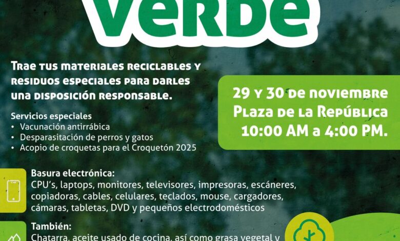 El municipio de Delicias llevará a cabo este 29 y 30 de noviembre el Reciclatón Eco Punto Verde, una jornada destinada a promover la correcta disposición de materiales reciclables y residuos especiales. De acuerdo con Juan Torrecillas, jefe de Medioambiente, el evento se realizará en la Plaza de la República, en horario de 10:00 de la mañana a 4:00 de la tarde.