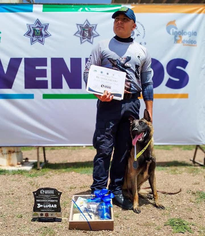 En este encuentro, el oficial Israel de Jesús Valdiviezo Méndez, integrante del Grupo K9 de la Dirección de Seguridad Pública Municipal de Delicias, acompañado de su binomio “Chuta”, un pastor belga malinois de tres años, logró obtener el tercer lugar a nivel estatal, colocándose entre los equipos más destacados de la competencia.