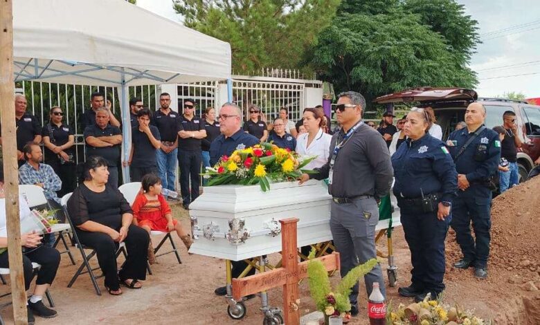 Chihuahua. – Decenas de personas, entre familiares, amigos, compañeros de trabajo y ciudadanos, acudieron esta tarde a despedir al policía municipal de Aldama, ejecutado la noche del viernes pasado.