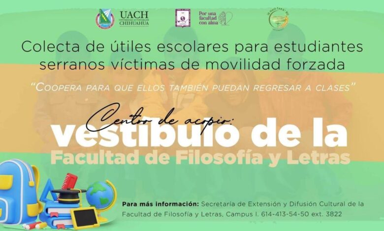 En un esfuerzo por apoyar a niñas, niños y jóvenes que han sido víctimas de desplazamiento forzado en la región serrana del estado, la Facultad de Filosofía y Letras de la Universidad Autónoma de Chihuahua (UACH) ha iniciado una campaña de colecta de útiles escolares.