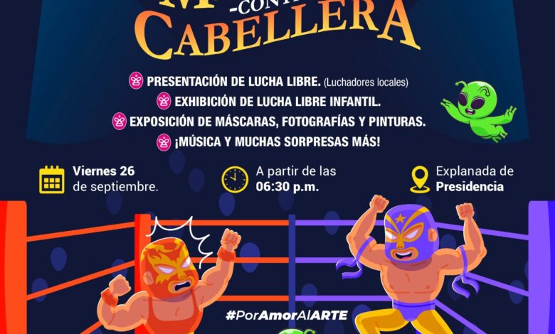 Meoqui.- Este viernes 26 de septiembre a partir de las 6:30 de la tarde, la explanada de la Presidencia Municipal de Meoqui será el escenario de la función de lucha libre “Máscara contra Cabellera”, evento que forma parte del programa cultural Por Amor al Arte, con presentaciones de luchadores locales, una exhibición de lucha libre infantil, así como exposición de máscaras, fotografías y pinturas, además de música y otras sorpresas para el público.