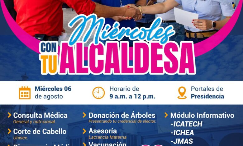 Meoqui.- La alcaldesa Miriam Soto y su gabinete atenderán a todos los meoquenses sin previa cita durante el programa “Miércoles con tu Alcaldesa”, contando con servicios totalmente gratuitos como consulta médica general, asesoría jurídica, donación de medicamentos, corte de cabello, entre otros, este 06 de agosto a partir de las 9 de la mañana.