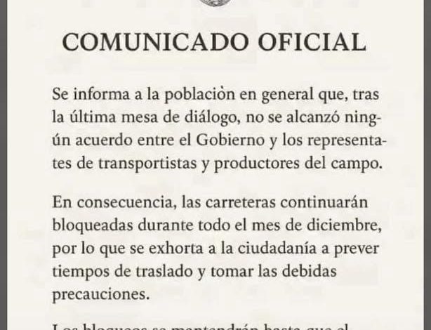 En un posicionamiento oficial, productores y transportistas anunciaron que, ante la falta de respuesta del gobierno federal, mantendrán los bloqueos carreteros de forma permanente durante todo el mes de diciembre. Pidieron a la ciudadanía prever rutas alternas y tomar precauciones, pues las vialidades seguirán interrumpidas hasta que haya soluciones concretos.