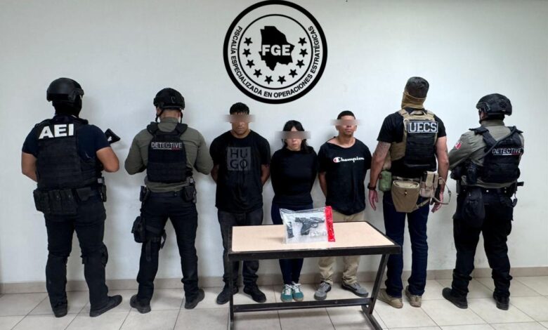 Durante la intervención, a uno de los masculinos se le aseguró un arma de fuego tipo pistola calibre .40, con 12 cartuchos útiles, quien de manera voluntaria proporcionó información del domicilio donde mantenían a la víctima. Los detenidos fueron identificados como Luz Sarai “N” de 36 años, Erick Francisco “N” de 33 años y Erick “N” de 30 años.