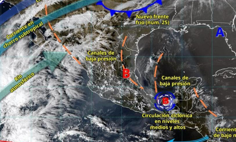 El frente frío y la masa de aire ártico que lo impulsa sobre el norte y noreste del país, en interacción con las corrientes en chorro polar y subtropical, una vaguada polar, un canal de baja presión y el flujo de humedad de un río atmosférico, favorecerán ambiente frío por la mañana, de frío a templado por la tarde, y temperaturas muy frías en la zona serrana, con heladas en varias partes de la sierra.